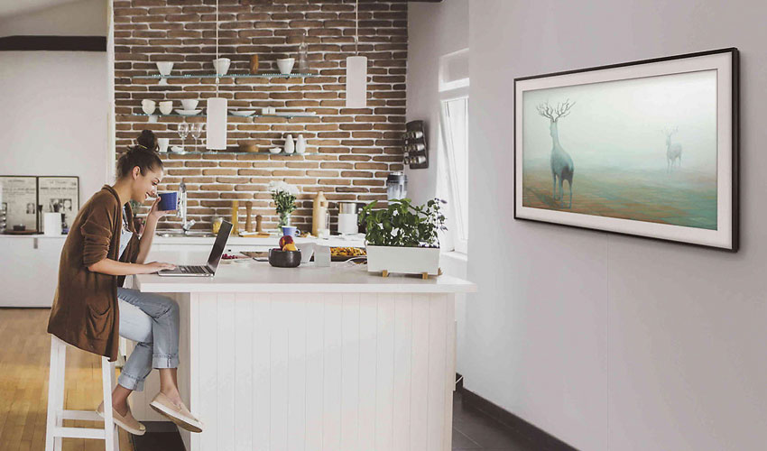 Beim Samsung The Frame TV LS03 stand der Hersteller vor der Herausforderung einen Fernseher in einen künstlerischen Kontext zu setzen. Heraus kam dabei der Samsung the Frame TV. Der Wohnraum verwandelt sich durch den Samsung the Frame in eine Galerie. Der Clou: Werden keine Filme und Co. mehr über den TV ausgestrahlt, verwandelt dieser sich in ein Kunstwerk, bzw. sehr viele Kunstwerke. Um dem ganzen noch die fast perfekte Illusion zu verleihen, stattet Samsung das Gerät mit einem nahezu unsichtbaren einzigen Kabel aus und bietet optionale Echtholz-Bilderrahmen an. Die One Connect Box mit allen Anschlüssen kann durch die One Invisible Connection ein gutes Stückweit entfernt positionert werden.